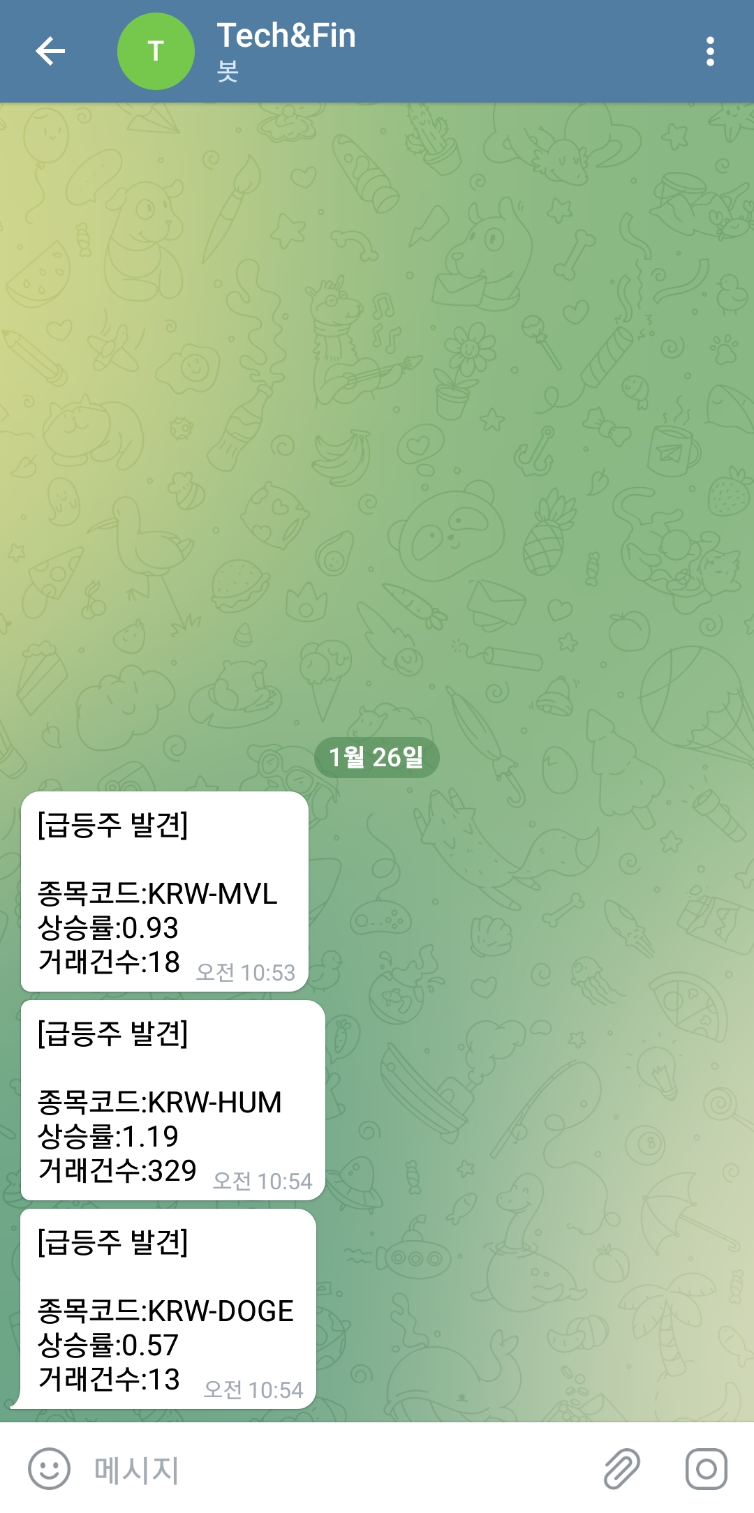 갑자기 10%가 상승하는 종목은 자주 나오는 것이 아니기 때문에 로직의 조건을 조금 낮추어 0.9% 이상 상승 및 거래건수 10건 이상으로 바꾸어 보니 위와 같이 대상이 발견되고 텔레그램으로 메세지를 수신 받을 수 있었습니다.