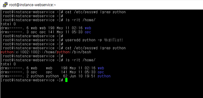 useradd python -p '비밀번호'