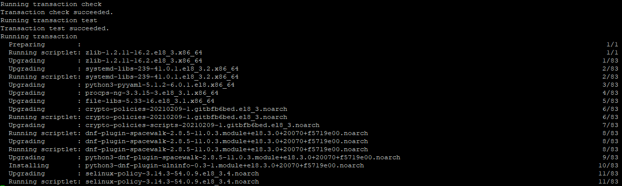 dnf update 또는 dnf upgrade 명령어를 이용해서 현재 설치되어 있는 패키지들을 최신 버전으로 업그레이드 할 수 있습니다. 두 명령어는 동일한 기능을 수행하기 때문에 아무거나 실행하면 됩니다.