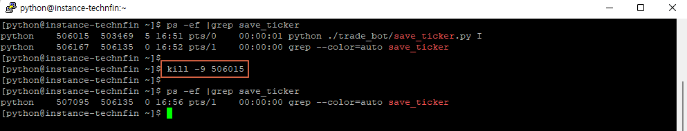 예시로 save_ticker가 포함된 프로세스를 찾으니 위와 같이 2개가 검색 되었습니다. 그 중에서 두 번째는 제가 검색을 위해 찾은 프로세스로 실제로 실행되고 있는 프로세스는 아님을 참고 부탁 드립니다.