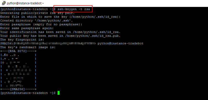 사용자 계정으로 로그인 한 상태에서 홈디렉토리에서 위의 명령어를 수행하면 .ssh 폴더가 만들어 집니다.