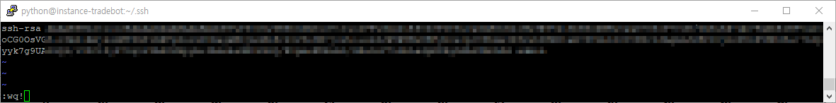 vi 에디터로 authorized_keys 파일을 만들면서 편집할 수 있습니다. vi 에디터가 열리면 PuTTYgen에서 생성한 Public Key를 붙여넣기 해 줍니다.