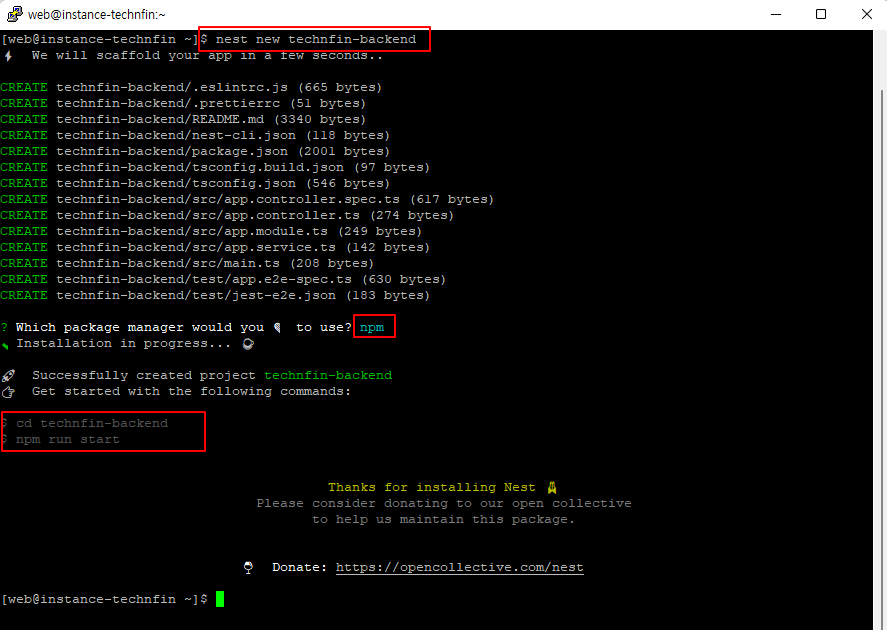 | 1. NestJS 프레임워크를 사용해 기본적인 구조의 백엔드 프로젝트를 생성합니다. 2. 서버에서 백엔드 프로그램을 실행하여 웹 브라우저를 통해 접속 가능하도록 설정합니다. |