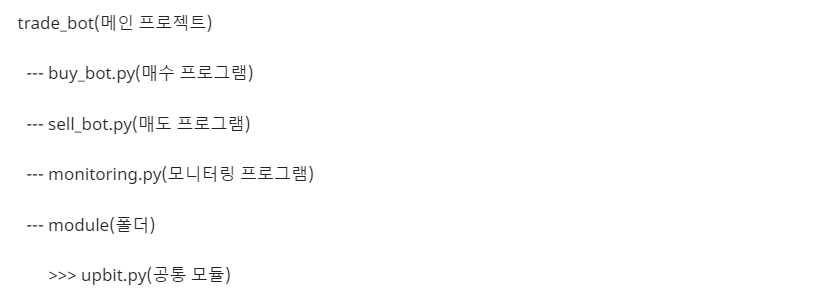 메인 프로젝트 아래 3가지 프로그램을 만들고 module 폴더 아래에 upbit.py라는 공통 모듈을 만들어서 3가지 프로그램에서 import하여 사용하는 간단한 구조 입니다.