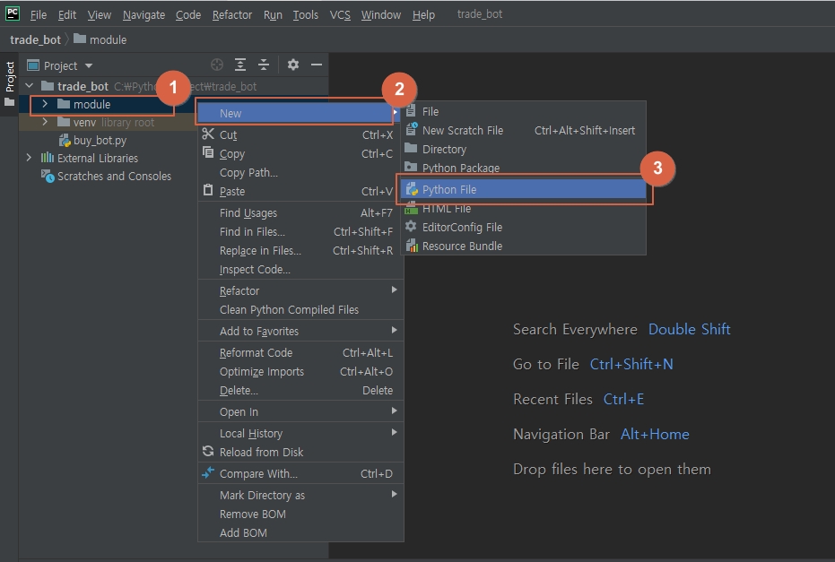 이번에는 ① trade_bot 메인 프로젝트에서 마우스를 우클릭한 후 ② New > ③ Python File을 클릭합니다.