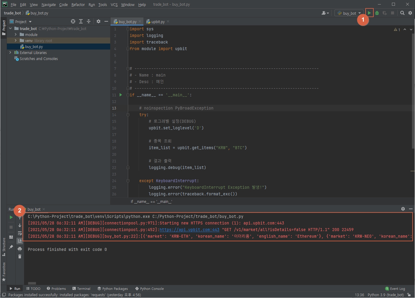 buy_bot 프로그램에서 ① 실행 버튼을 클릭하면 ② 결과가 정상적으로 출력됨을 확인할 수 있습니다.