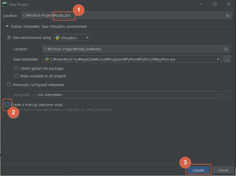 ① trade_bot 으로 메인 프로젝트 이름을 정합니다.