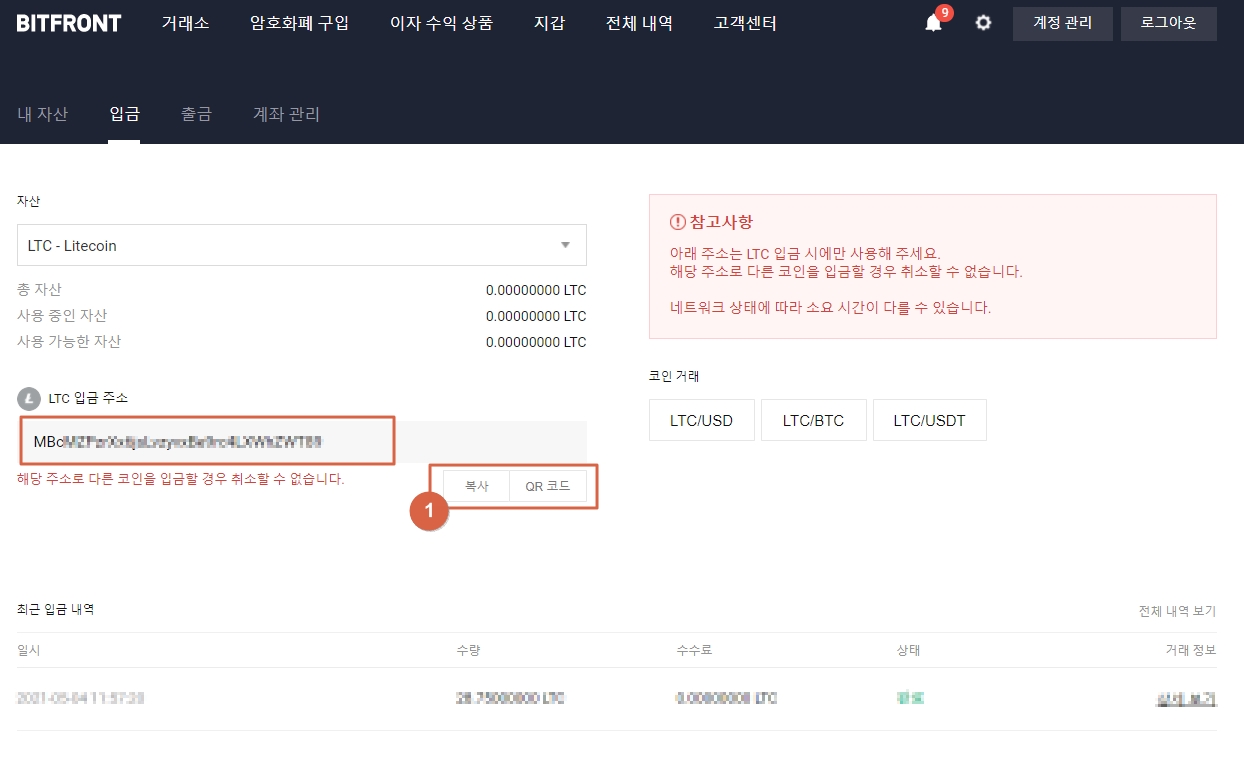 라이트 코인(LTC)의 입금 주소가 나오면 ① 복사 또는 QR코드를 이용해서 전송을 진행 합니다. 전송 주소는 주의사항에서 말씀드린바와 같이 가급적이면 직접 타이핑하지 않는 것이 좋습니다.