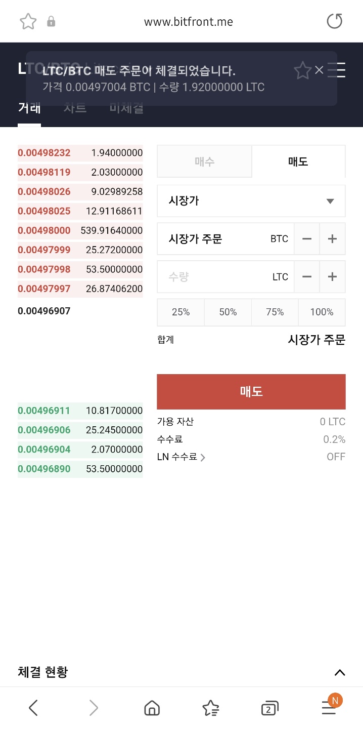 거래소로 이동 후 LTC/BTC에서 LTC를 매도합니다. 시장가 매도를 하면 거래가 바로 이루어지지만 호가 차이가 큰 경우에는 손해를 볼 수도 있으니 시간이 충분하고 조금 더 좋은 가격에 매도하려면 원하는 가격에 지정가 매도를 하시는 것이 더 좋을수 있습니다.