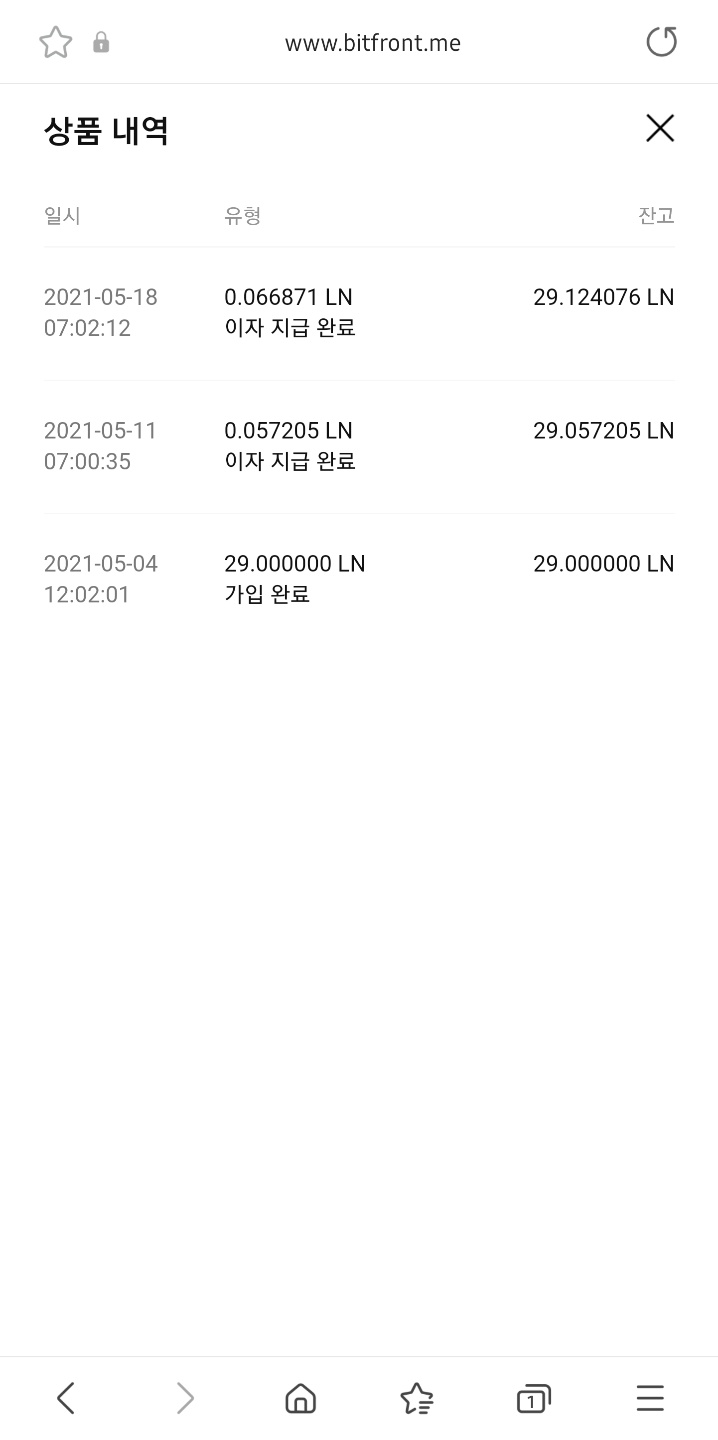 가입이 완료되면 상품 내역 메뉴에서 납입된 링크코인(LN)의 잔액을 확인할 수 있습니다.