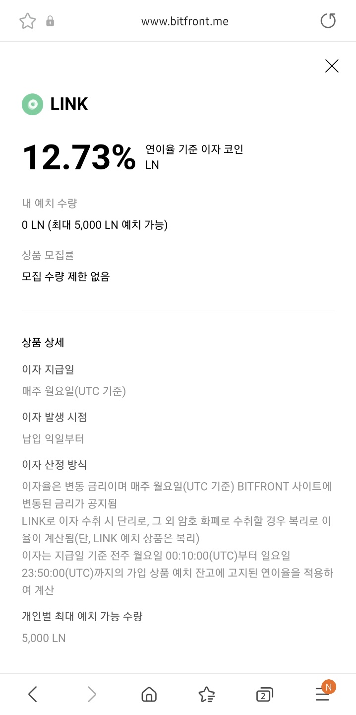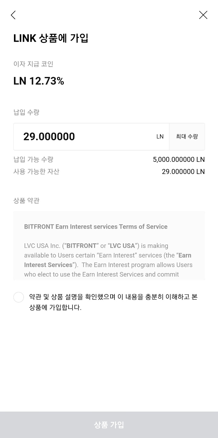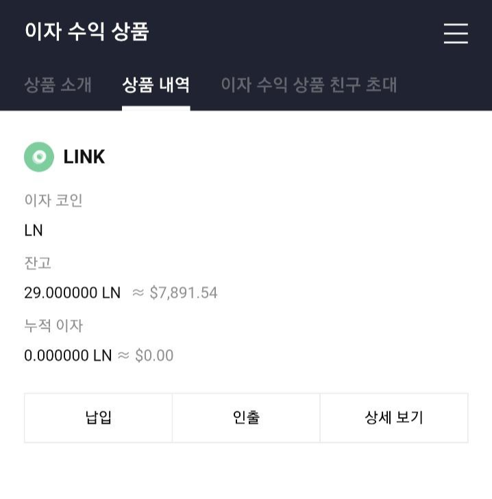 은행 적금과 비슷한 개념으로 생각하시면 되는데요. 이자수익상품에 가입하면 잦은 거래를 하기 어렵기 때문에 링크코인(LN)을 단타매매 목적으로 구입하신 분들은 가입하지 않는 것이 좋으며 중/장기간 보유할 분들에게 적절한 상품입니다.