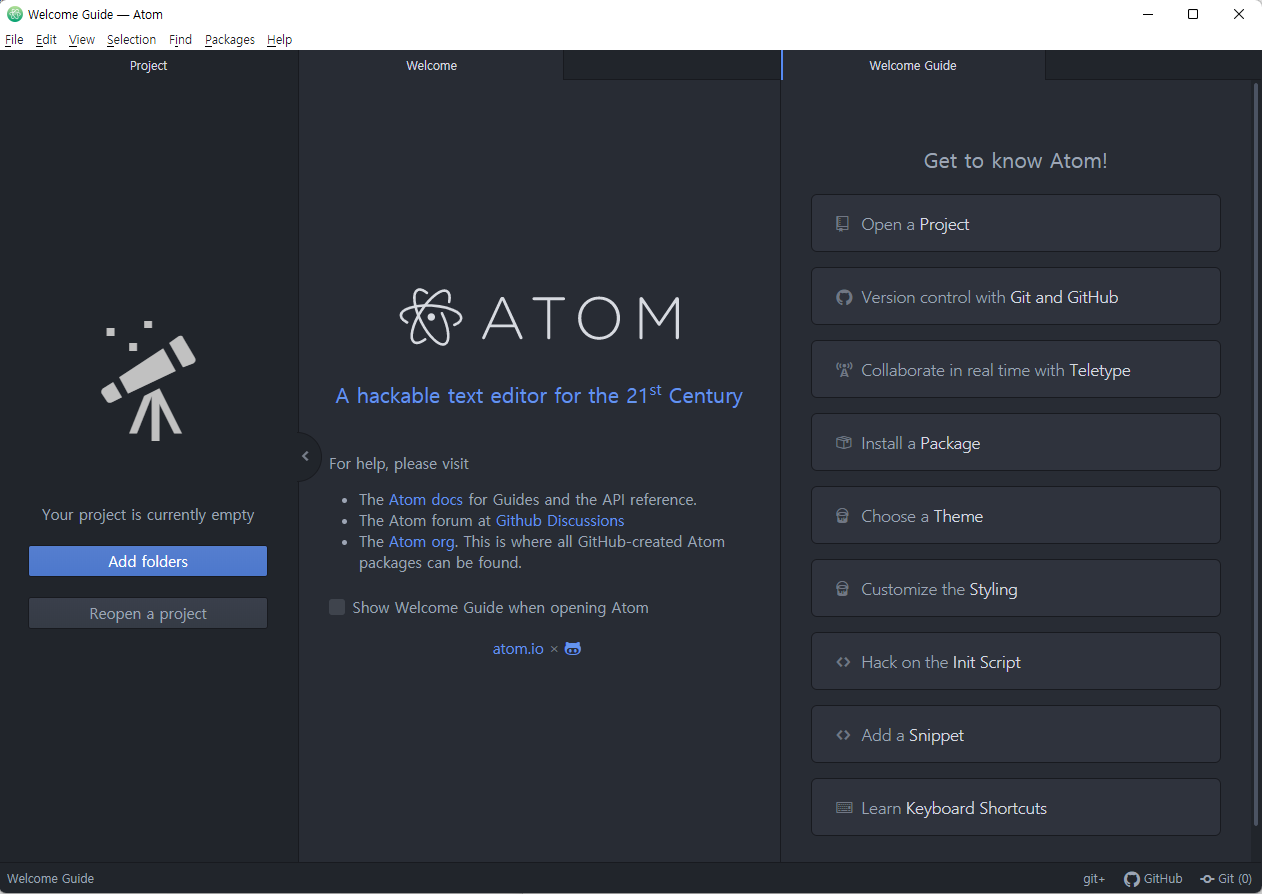 먼저 아래 아톰(Atom) 공식 홈페이지에서 사용하는 OS 버전에 맞는 파일을 다운로드 합니다. 윈도우나 Mac 버전을 선택하여 설치할 수 있습니다.