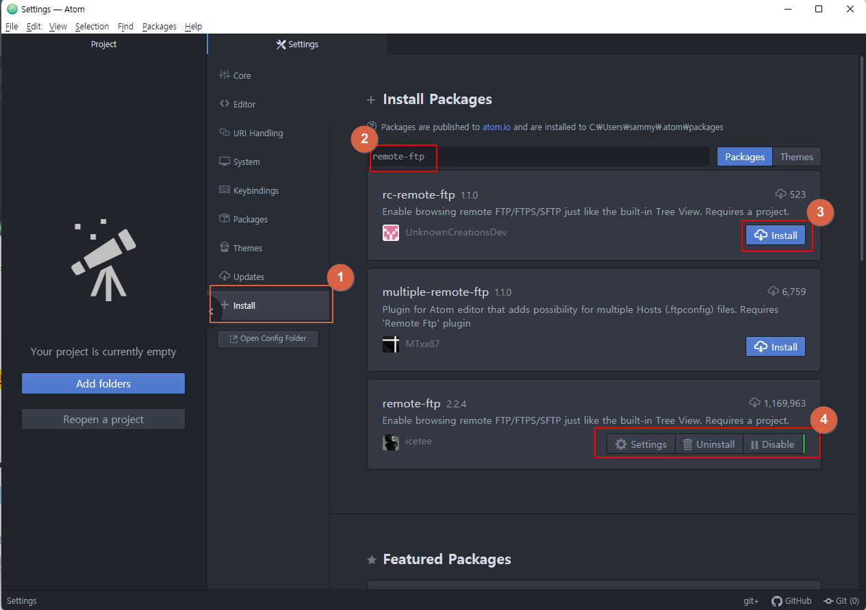 아톰 에디터에서는 기능을 확장할 수 있는 플러그인 패키지를 설치할 수 있습니다. 예를 들어 FTP 관련 플러그인 패키지를 설치하면 FTP로 접속하여 로컬에서 개발중인 파일을 편리하게 서버에 업로드 하거나 서버의 파일을 로컬로 다운로드 받을 수 있게 되어 개발한 내용을 서버에서 확인하기 한층 편리해 집니다.