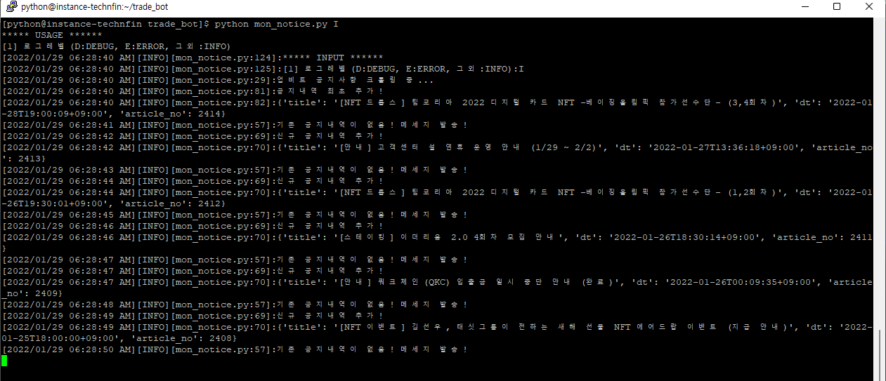 오늘 살펴본 내용은 단순히 공지사항을 크롤링하여 텔레그램으로 알림을 받는 것이지만 알림을 받는 로직에 매수 로직을 추가할 수도 있습니다.