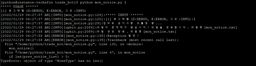 mon_notice.txt 빈 파일을 먼저 하나 생성해 주어도 되고 생성하지 않고 프로그램을 수행하면 파일을 자동으로 생성합니다. 오류가 발생하지만 파일이 생성된 후 다시 수행하면 그 이후부터는 에러가 발생하지 않습니다.