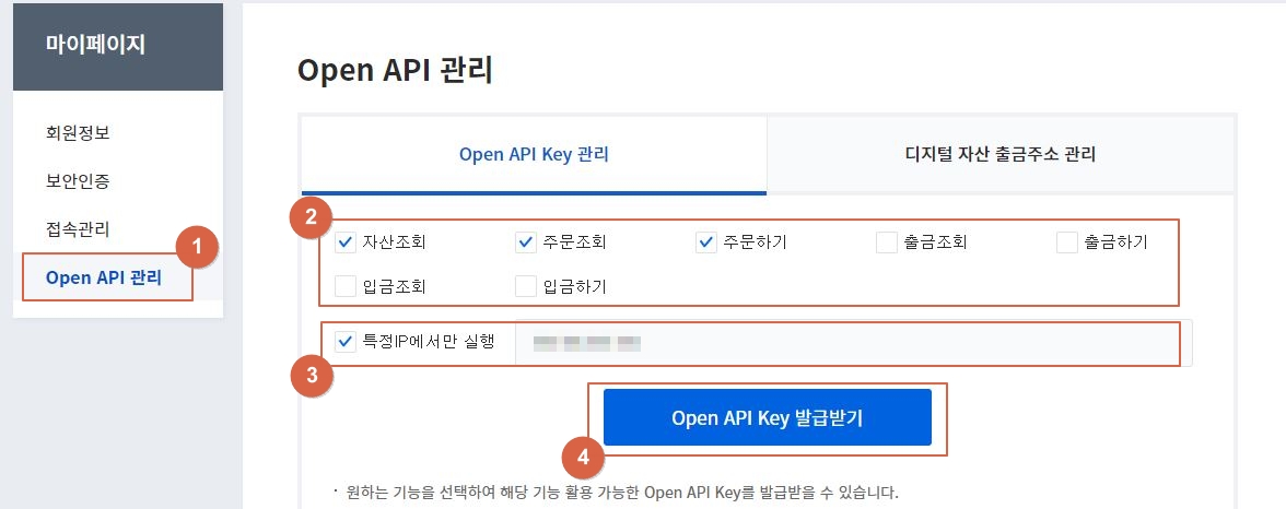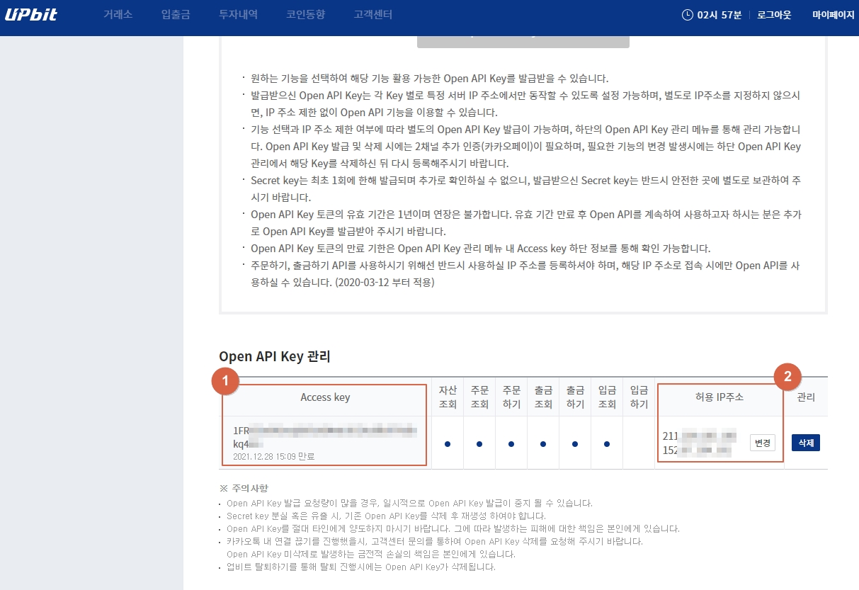 API KEY가 노출되는 경우에 소중한 자산을 모두 잃어 버릴 수 있으니 허용 IP설정은 꼭 하시는 것을 권장 드립니다.