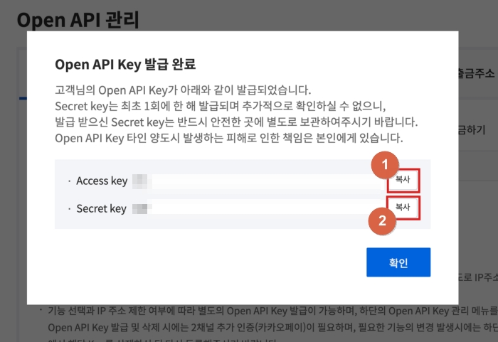 Secret Key는 이 화면을 닫으면 다시 확인할 수 있는 방법이 없습니다. 반드시 확인 버튼을 누르기 전에 복사하여 안전한 곳에 보관해야 합니다.
