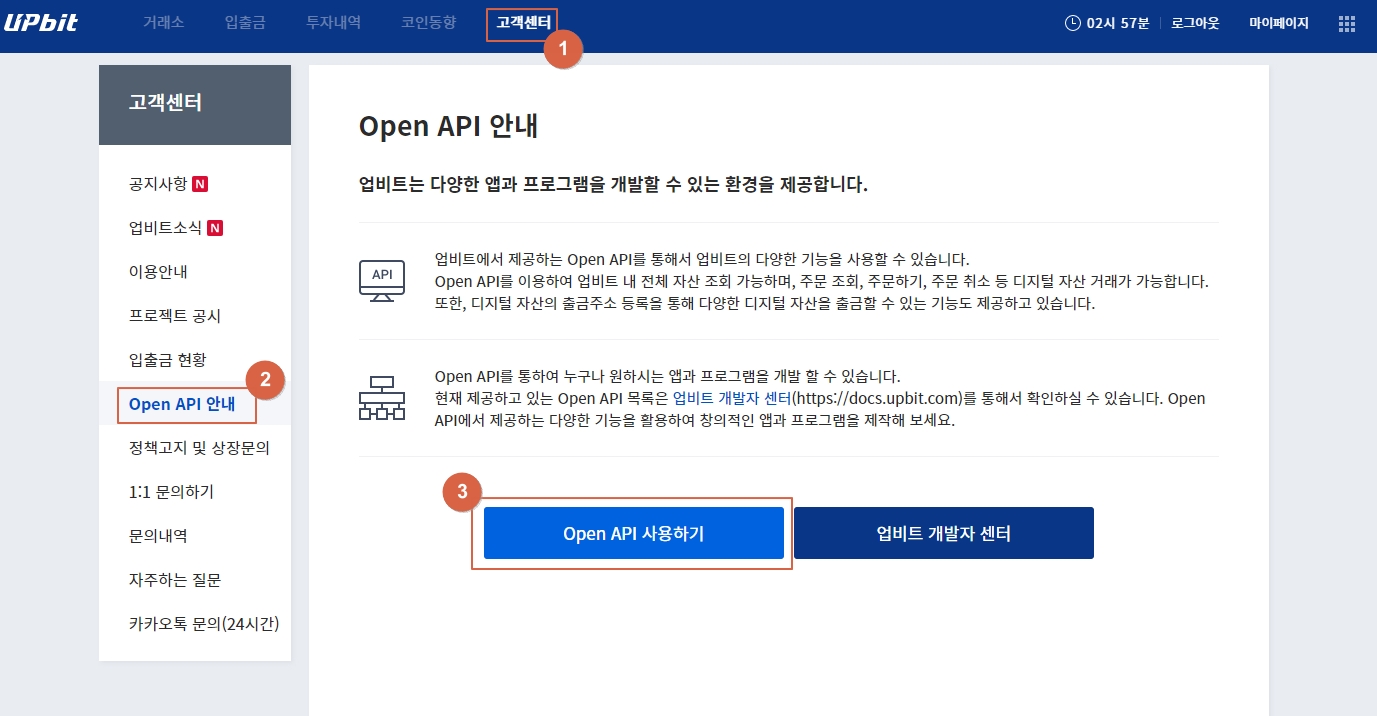 상단 메뉴에서 ① 고객센터를 클릭한 후 왼쪽 메뉴에서 ② Open API 안내를 클릭한 다음에 ③ Open API 사용하기 버튼을 클릭 합니다.