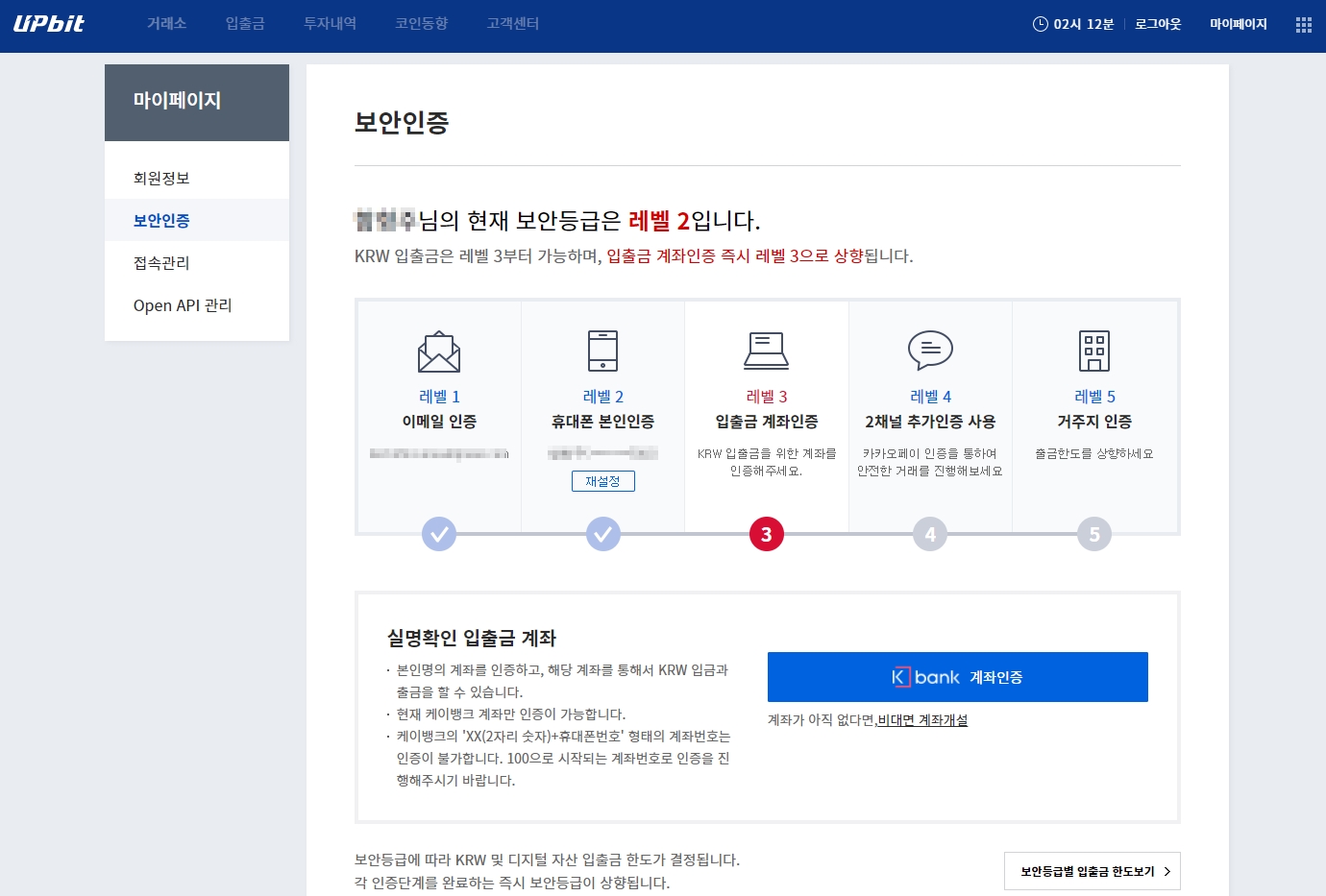 이런 경우에는 입출금 계좌 인증과 2채널 추가인증을 진행하여 보안등급을 레벨4로 높인 후에 진행해야 합니다.