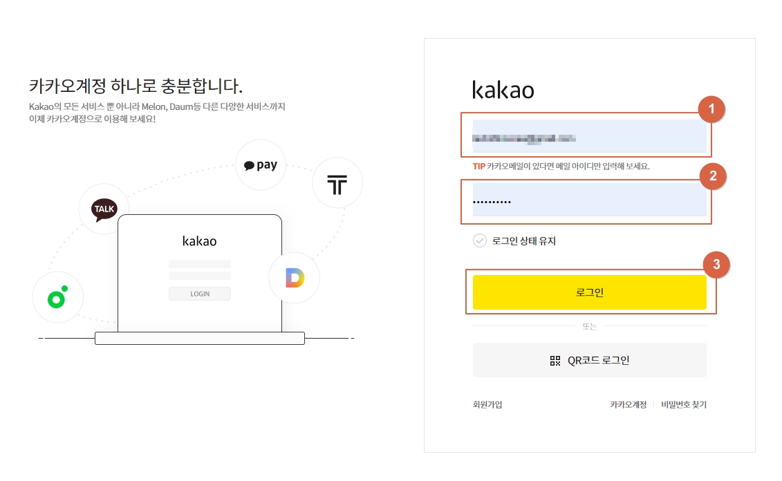 ① 카카오 계정 이메일과 ② 비밀번호를 입력하고 ③ 로그인 버튼을 클릭합니다.