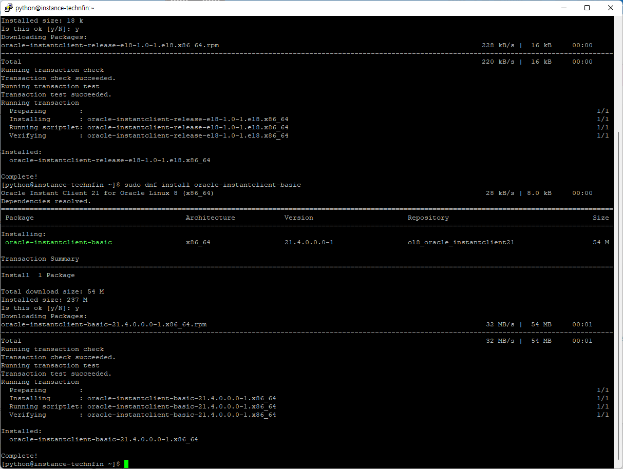 위의 명령어를 차례대로 실행하여 오라클 클라이언트를 설치 합니다.