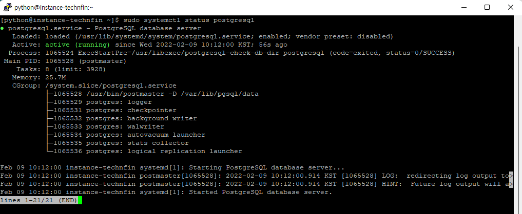 PostgreSQL 서비스 상태를 확인합니다. active 상태로 정상적으로 postgreSQL 데이터베이서 서버가 실행되고 있음을 알 수 있습니다.