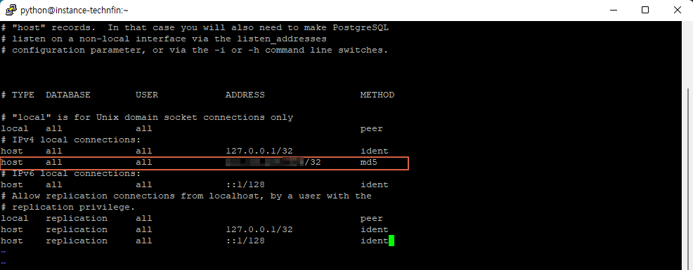 위의 파일을 열고 IPv4 섹션에 DBWeaver를 이용해서 접속을 진행할 PC의 IP를 입력합니다. 인증방식은 Password 기반인 md5로 합니다.