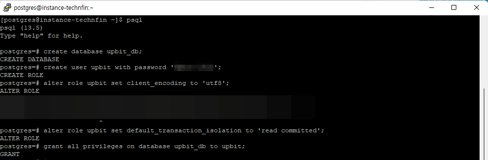 위의 명령어를 순차적으로 실행하여 새로운 DB 이름을 upbit_db로 생성하고 사용자 계정을 upbit로 생성한 후 권한을 부여해 줍니다.
