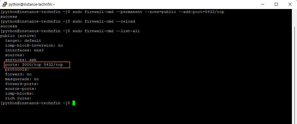 --list-all 옵션을 사용하면 현재 방화벽에 개방되어 있는 포트를 확인할 수 있습니다. 5432번 포트가 정상적으로 개방 되어 있음을 확인할 수 있습니다.