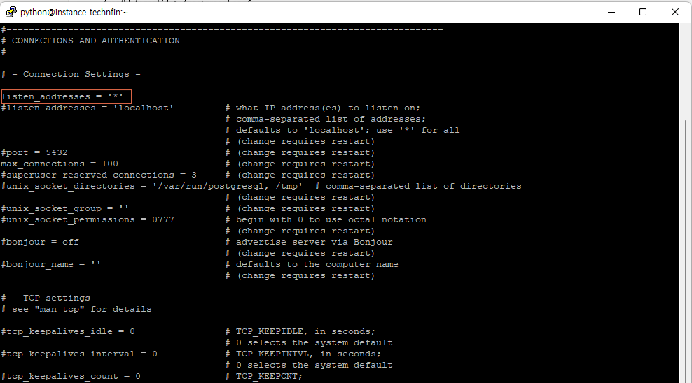 위의 파일을 열어 listen_addresses = '*' 을 추가해 줍니다.