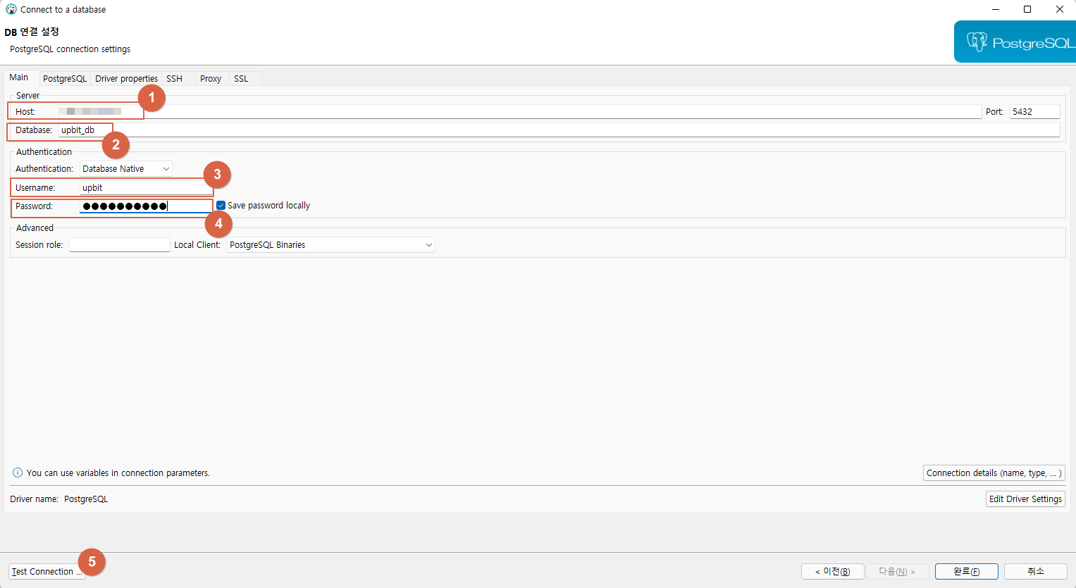 ① PostgreSQL 서버가 설치되어 있는 서버의 IP주소를 입력합니다.