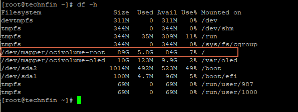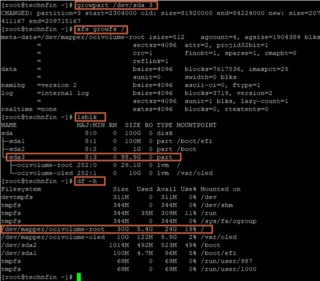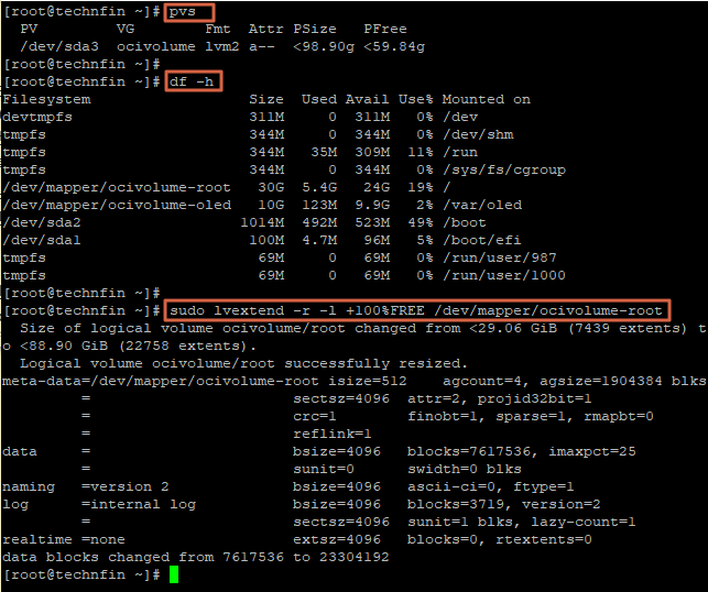 sudo lvextend -r -l +100%FREE /dev/mapper/ocivolume-root