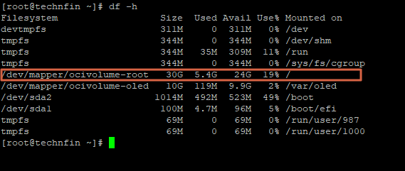 루트(/)에 할당된 용량은 df 명령어를 이용해서도 확인할 수 있습니다. 30G가 할당되어 있으며 5.4G를 사용하고 24G가 남아 있음을 확인할 수 있습니다.