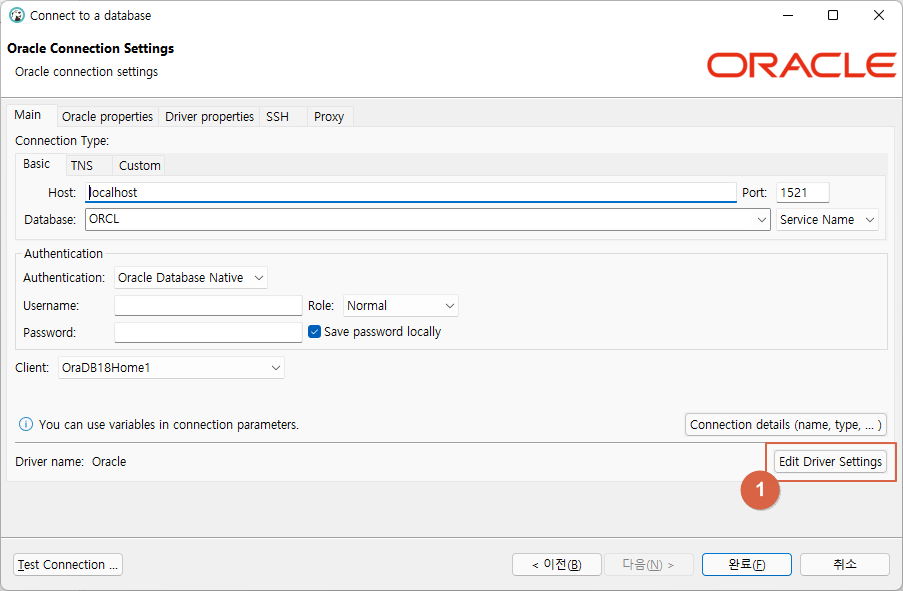 ① Edit Driver Settings를 클릭하여 먼저 다운로드 받은 OJDBC 드라이버를 설정해 주겠습니다.