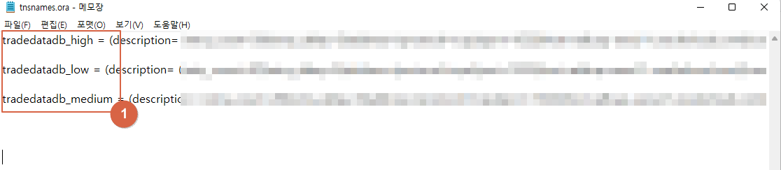 여기서 tradedatadb_high는 데이터베이스 이름을 다르게 생성했다면 생성한 db이름으로 교체해 주시면 됩니다. 아까 tnsnames.ora에서 확인할 수 있습니다. 뒤에 월렛 경로도 다른 곳에 압축을 해제했다면 해당 폴더에 맞게 변경하면 됩니다. 이 때 윈도우 환경에서는 역슬래시 두번(\\)으로 경로를 적어야 인식이 되는 점을 유의 부탁 드립니다.