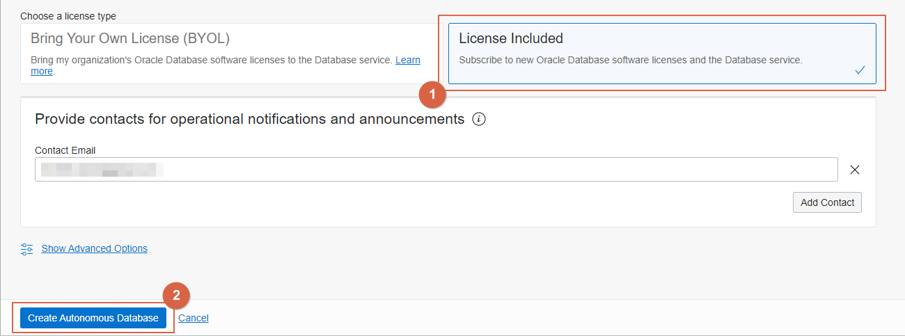 ① License Included를 선택하고 ② Create Autonomous Databse를 클릭하면 됩니다.