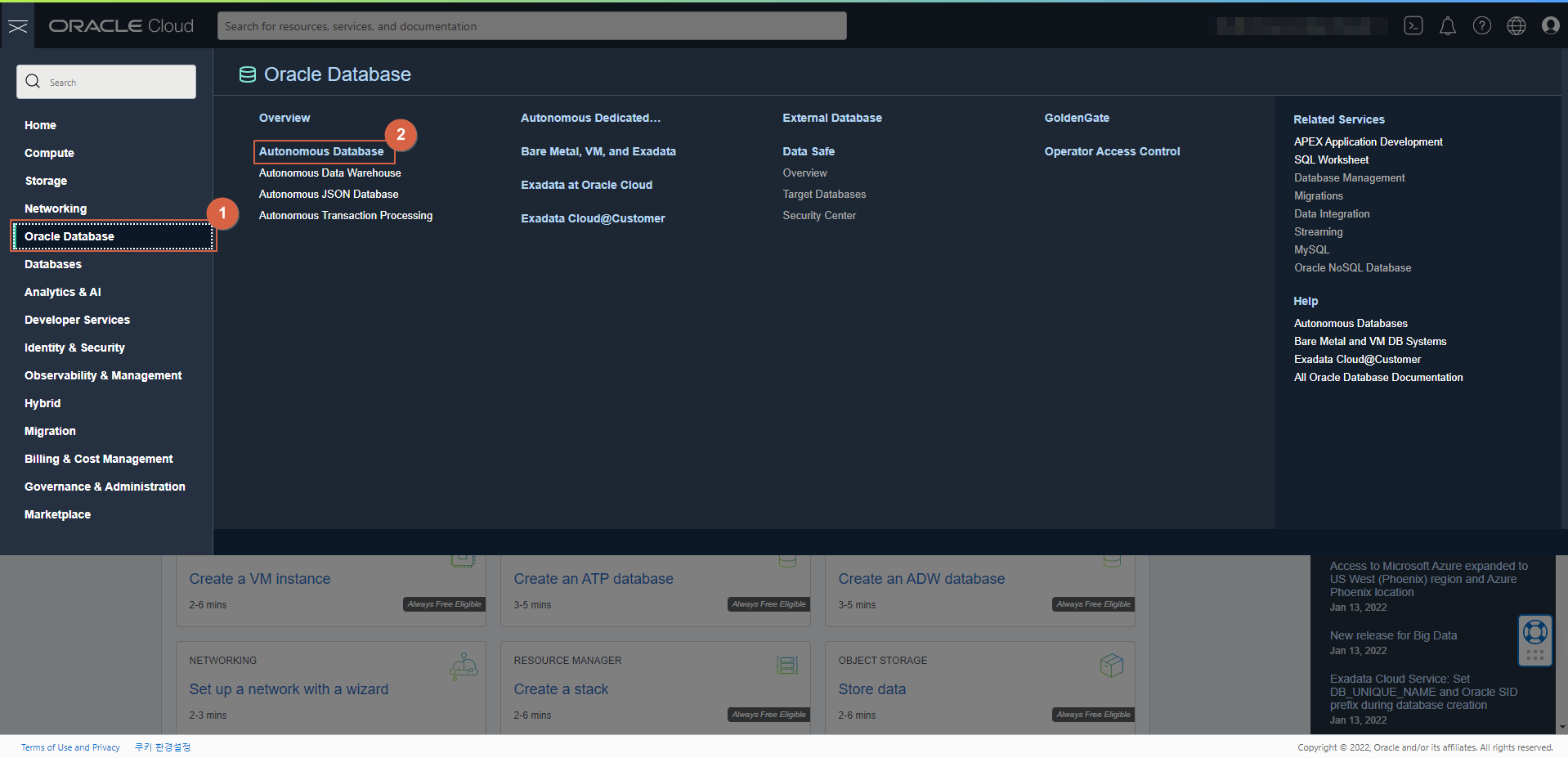 오라클 클라우드 프리티어 관리 페이지에 접속하여 ① Oracle Database ② Autonomous Database 를 클릭합니다.