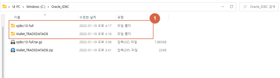 다운로드 받은 월렛과 JDBC드라이버 파일을 C드라이브 아래 원하는 폴더에 압축을 해제 합니다. 위의 예시에서는 C드라이브 아래 Oracle_JDBC 폴더를 만들어서 각 파일명대로 압축을 해제하였습니다.