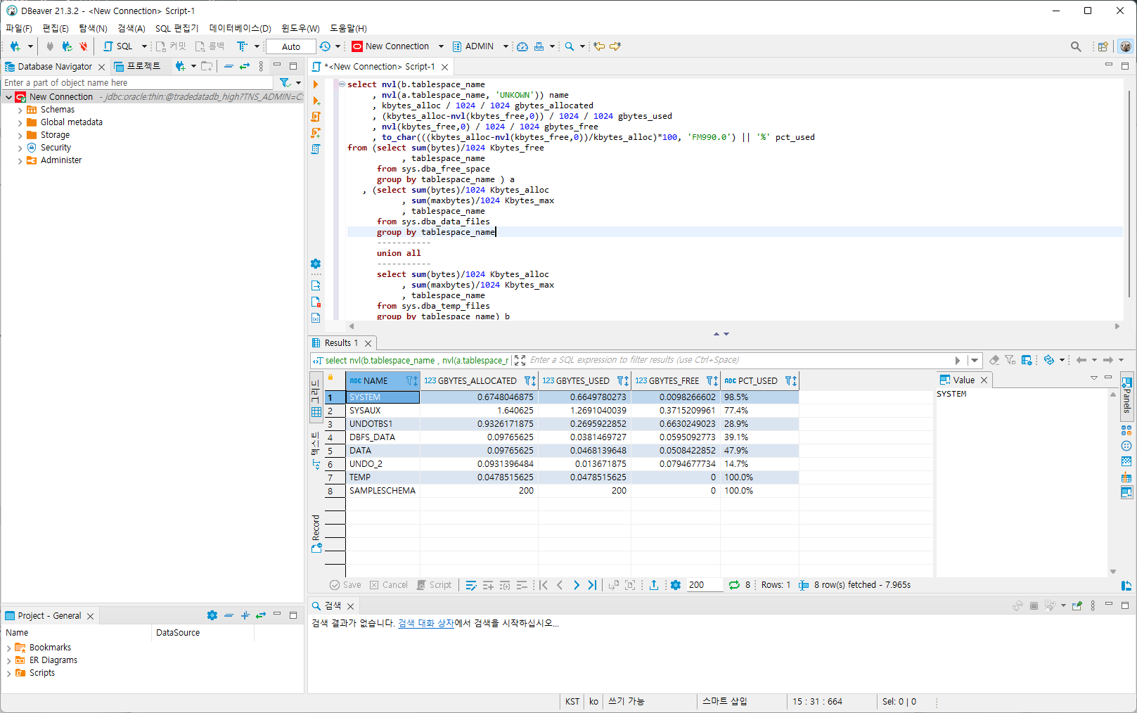 이후 접속하여 SQL창을 하나열고 테스트로 테이블 스페이스 용량을 조회해 보았습니다. DATA라는 테이블스페이스가 우리가 사용할 공간인데 현재는 아주 작게 할당되었지만 데이터가 쌓이면서 20GB까지 계속해서 자동으로 증가하게 되니 이 부분을 참고하면서 모니터링 하시면 됩니다.