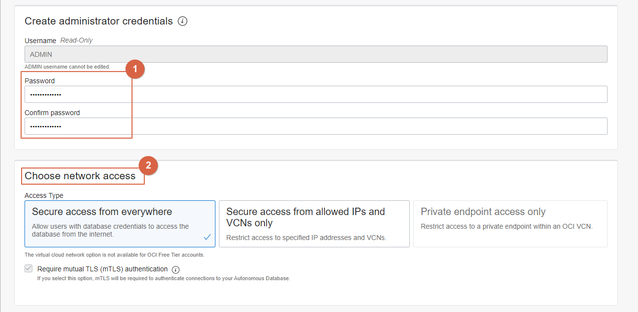 기본 ID는 ADMIN으로 수정할 수 없으며 ① 비밀번호를 설정합니다. 두 번째는 보안 접속 관련인데요. 어디에서든 접속이 가능하도록 Secure access from everywhere를 선택하겠습니다. 보안을 강화하기 위해 허용된 IP에서만 접속을 하도록 하려면 두 번째 옵션을 선택하면 됩니다.