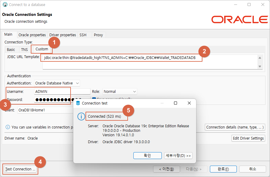 여기서 tradedatadb_high는 데이터베이스 이름을 다르게 생성했다면 생성한 db이름으로 교체해 주시면 됩니다. 아까 tnsnames.ora에서 확인할 수 있습니다. 뒤에 월렛 경로도 다른 곳에 압축을 해제했다면 해당 폴더에 맞게 변경하면 됩니다. 이 때 윈도우 환경에서는 역슬래시 두번(\\)으로 경로를 적어야 인식이 되는 점을 유의 부탁 드립니다.