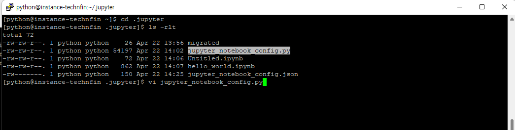 .jupyter 폴더의 jupyter_notebook_config.py 파일을 vi에디터로 오픈합니다.