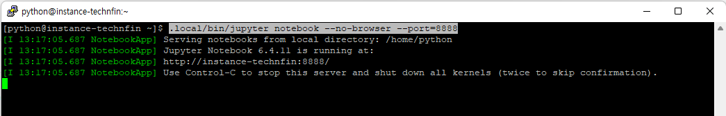리눅스에서 실행을 하기 때문에 no-browser 옵션을 사용하였고 8888번 포트를 사용하여 실행했습니다.