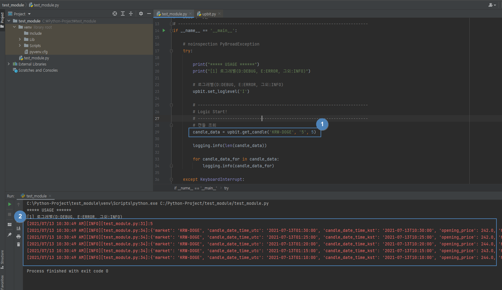 위와 같이 호출하게 되면 도지코인(KRW-DOGE)에 대해서 5분봉을 최근 기준부터 5개 조회하게 됩니다. ②번과 같이 정상적으로 캔들정보 조회 후 결과가 출력되었음을 확인할 수 있습니다.
