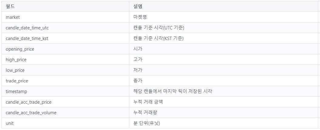 분봉의 경우 위와 같은 리턴 결과를 받으실 수 있습니다. 하지만 조회 결과는 캔들 종류에 따라 약간씩 다르기도 하고 업비트에서 언제든지 변경할 수 있기 때문에 아래 링크를 통해 업비트 개발자 센터에서 최신 내용을 확인하시는 것이 좋을 것 같습니다.