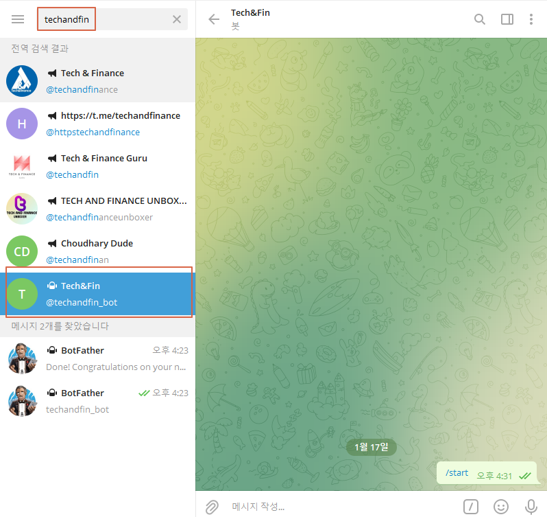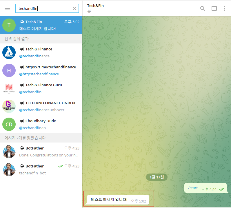 ② Bot의 이름을 정합니다. 저는 Tech&Fin으로 하겠습니다. 자유롭게 정하시면 됩니다.
