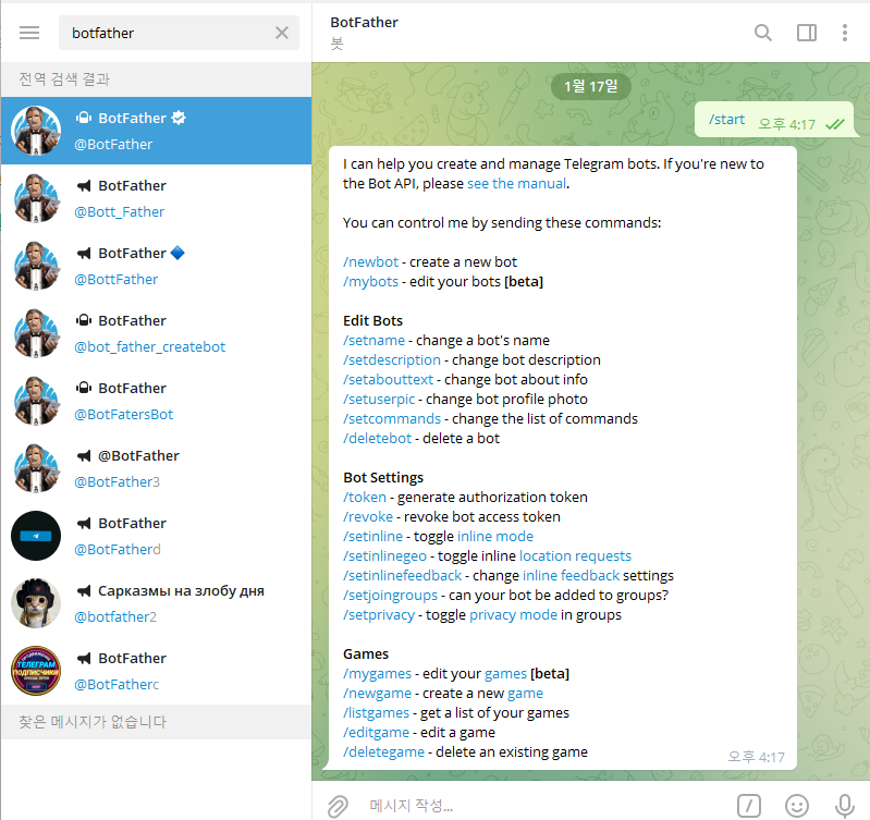 여러가지 실행할 수 있는 명령어가 있는데 이 중에서 새로운 봇을 생성하기 위해 /newbot을 입력하여 새로운 봇을 생성해 보도록 하겠습니다.