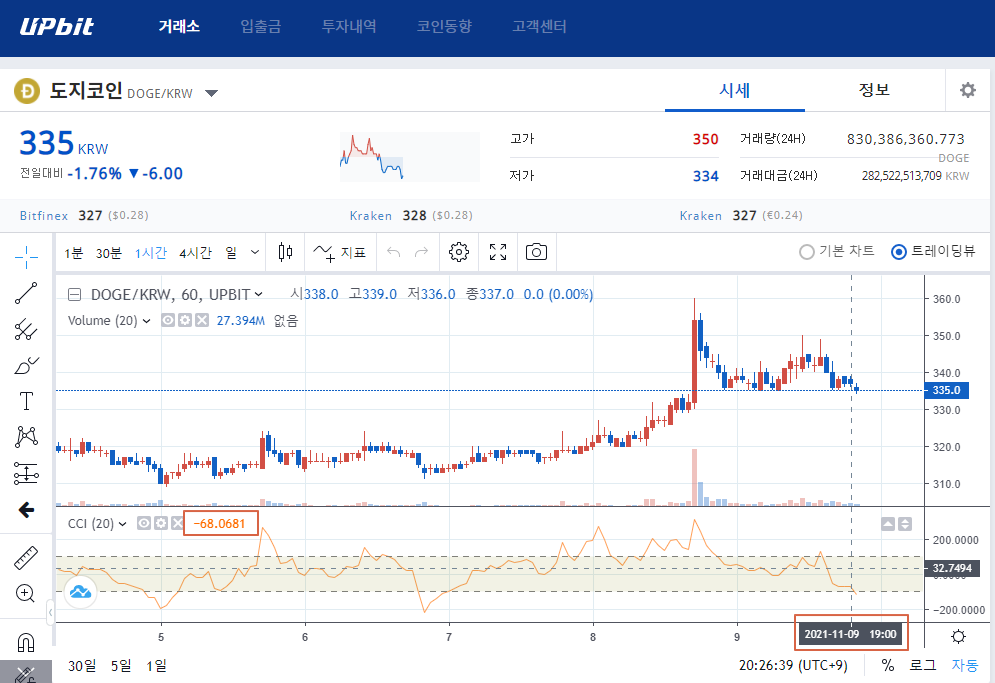도지코인, 60분봉 기준 11월 9일 19시 캔들의 CCI는 -68.0681이 계산되었습니다.