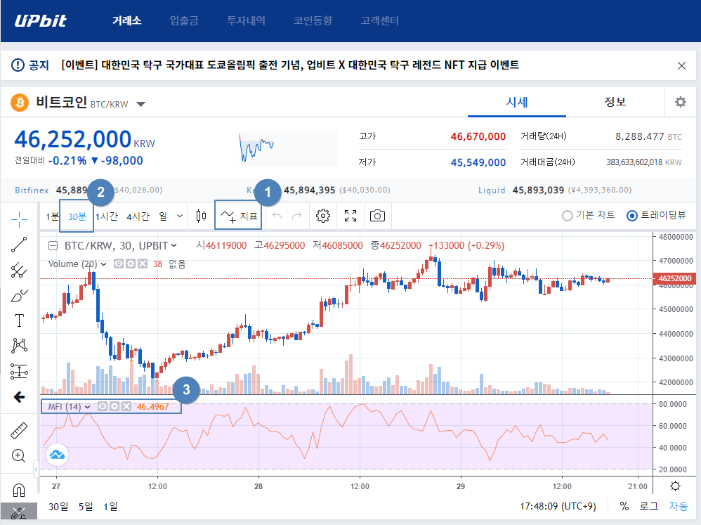 업비트에서 ① 지표를 눌러 MFI를 선택한 후 ② 30분봉을 선택하면 30분봉 기준으로 조회된 MFI값이 맞는지 검증할 수 있습니다.