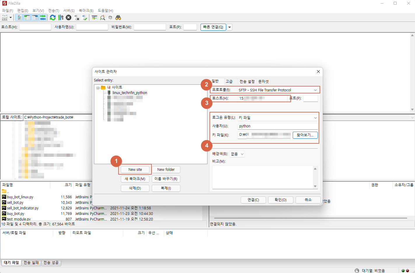 파일질라 프로그램을 실행하고 상단 메뉴에서 파일(F) > 사이트 관리자(S)를 클릭하면 위와 같은 팝업이 나오게 되는데요. ① New site 를 클릭하여 새로운 사이트를 설정하거나 기존 사이트를 수정하면 됩니다.